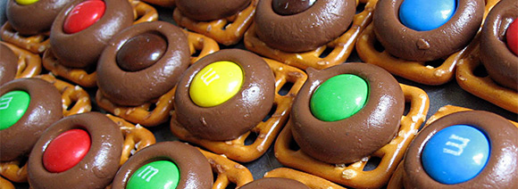Holiday Pretzel Treats. This is one of my favorites for the holidays. You can use the different color M&M’s for instance red, pink and white for Valentines or the pastel M&M’s for Easter, etc. Ingredients Needed: 1 bag of bite size waffle pretzels, 2 bags Hershey kisses, 1 bag M&M’s. Preheat oven to 170. Fill the pan with bite size waffle shaped pretzels (one for each treat in a single layer on a cookie sheet lined with parchment paper), then top each pretzel with an unwrapped Hershey’s kiss or Hershey’s hug. Bake 4-6 minutes (the white chocolate will melt faster) until the chocolate feels soft when touched with a wooden spoon. Remove the cookie sheet from the oven and quickly press an M&M candy into the center of each kiss. Allow the treat to cool for a few minutes and then place them in the refrigerator for about 10 minutes to set.