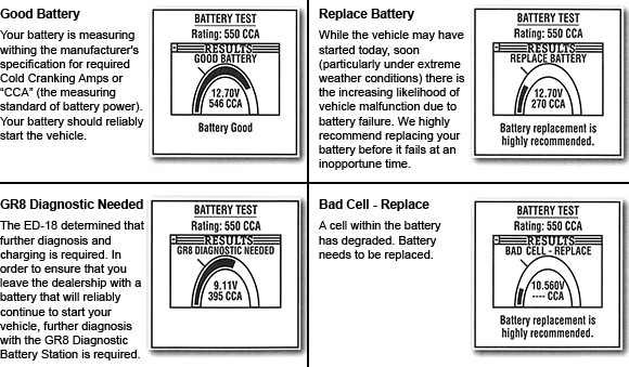 Below are the 4 possible battery test results from the ED-18 or GR8 diagnostic tester.