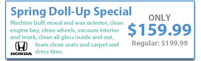 Spring is here and no better time to get your vehicle back in shape with our Doll-Up Special that includes a machine buff, reseal and wax exterior, clean engine bay, clean wheels, vacuum interior and trunk, clean all glass inside and out, foam clean seats and carpet and dress tires.