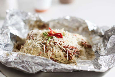 - Bake 30 min. or until chicken is done (165°F). Let stand 5 min. Cut slits in foil to release steam before opening each packet. Sprinkle with Parmesan before serving.