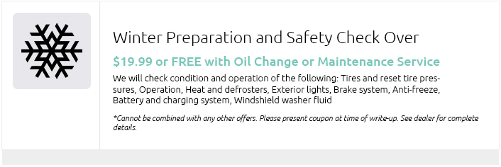 Winter Preparation and Safety Check Over. We will check condition and operation of the following: Tires and reset tire pressures, Operation, Heat and defrosters, Exterior lights, Brake system, Anti-freeze, Battery and charging system, Windshield washer fluid.
