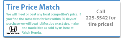 Tires! Tires! Tires! We Will Not Be Undersold! We will meet or beat any local competitor’s price. If you find the same tires for less within 30 days of purchase we will beat it! Must be exact size, make and model tire as sold by us here at Ralph Honda. Internet & Club tires excluded. Call 225-5542 for tire prices! Prices vary by model. Plus taxes and fees where applicable. Please present coupon during write up. Cannot be combined with any other discounts.
