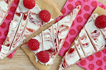 Make It: Heat oven to 350°F. On pizza board or in ungreased 12-inch pizza pan, roll out sugar cookie dough with floured rolling pin to a perfect round shape. Bake 15 to 18 minutes or until crust is golden brown and set. Cool about 30 minutes. While crust is cooling, in medium bowl, beat cream cheese, sugar and vanilla with electric mixer on high speed 3 to 5 minutes or until fluffy and well blended. Place preserves in small microwavable cup or bowl; microwave on High 15 to 30 seconds or until melted and smooth. Spread cream cheese mixture over cooled crust to within 1/2 inch of edge. Drop spoonful’s of melted preserves over cream cheese. Using butter knife, swirl preserves through cream cheese into a decorative design. Garnish with raspberries. Refrigerate at least 1 hour before serving.