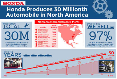 Honda has built its 30 millionth automobile in North America. This milestone was achieved by Honda’s eight auto plants in the United States, Canada, and Mexico. Honda started auto production in North America in Marysville, Ohio, on Nov. 1, 1982. Last year, more than 97 percent of the Honda and Acura automobiles sold in the U.S. were produced in North America.