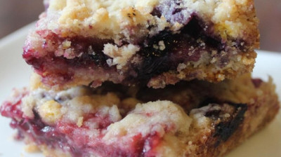 Blueberry Crumb Bars. What You Need: 1 1/2 cup sugar, 1 teaspoon baking powder, 3 cups all-purpose flour, 1 cup shortening, 1 egg, 1/4 teaspoon salt (optional), 1 pinch cinnamon (optional), 4 cups fresh blueberries, 3 teaspoons cornstarch. Make It: Preheat the oven to 375 degrees. Grease a 9×13 inch pan. In a medium bowl, stir together 1 cup sugar, 3 cups flour and baking powder. Mix in salt and cinnamon if desired. Use a fork to blend the shortening and egg. Dough will be crumbly. Pat half of dough into prepared pan. In another bowl, stir together 1/2 cup sugar and cornstarch. Gently mix in the blueberries. Sprinkle the blueberry mix evenly over crust. Crumble remaining dough over the berry layer. Bake for 45 minutes, or until top is slightly brown. Cool completely before cutting into squares.