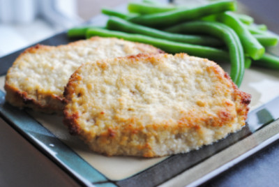 What You Need: 4 pork chops, 1 tablespoon olive oil, 1 cup Parmesan cheese (Kraft), 1 cup Italian bread crumbs, 1 tsp pepper, 1 tsp garlic powder