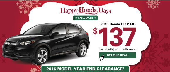 2016 Honda HR-V LX CVT AWD: MSRP $22,065 – RU6HGEW. 36 month closed end lease. $3499 trade or cash down. First payment, $595 acquisition fee, taxes and DMV fees due at signing. 12,000 miles/year. $0.15 overage. To qualified buyers through AHFC. Offer valid through 11/30/2016.