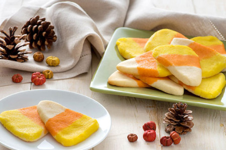 Candy Corn Cookies. Ingredients: 1 pkg (8oz) cream cheese, softened 1 cup butter or margarine, softened 2/3 cup sugar 1/2 tsp vanilla 2-1/2 cup flour 1 pkg (3oz) JELL-O orange flavor gelatin 1 pkg (3oz) JELL-O lemon flavor gelatin 1/4 cup water, divided. Directions: Heat oven to 350 degrees. Beat cream cheese, butter, sugar and vanilla in large bowl with mixer until blended. Gradually add flour, mixing well after each addition. Shape into 12-inch log. (Dough will be sticky.) Refrigerate 30 min.; reshape into triangular-shaped log. Cut dough into 1/4-inch-thick slices; place, 2 inches apart, on baking sheet. Bake 12 to 15 min. or until edges are lightly browned. Cool on baking sheets 1 min. Remove to wire racks; cool completely. Bake 12 to 15 min. or until edges are lightly browned. Cool on baking sheets 1 min. Remove to wire racks; cool completely.