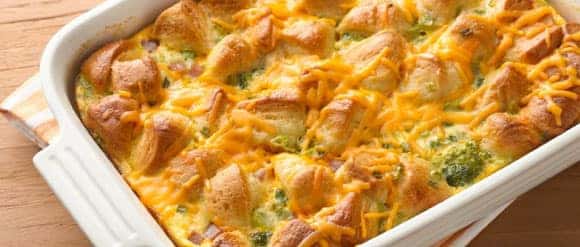 Cheesy Ham and Egg Bubble-Up Bake INGREDIENTS 1 box (10 oz) frozen broccoli & zesty cheese sauce 1 can (10.2 oz) Pillsbury™ Grands!™ Flaky Layers refrigerated Original biscuits 9 eggs 1 1/2 cups whole milk or 2% milk 1 3/4 cups diced cooked ham 1/3 cup chopped green onions 1 1/2 cups shredded extra sharp Cheddar cheese (6 oz) MAKE IT 1. Heat oven to 350°F. Spray 13×9-inch (3-quart) glass baking dish with cooking spray. Microwave broccoli 1 to 2 minutes or just until thawed. Separate dough into 5 biscuits; cut each into 8 pieces. Place evenly in dish. 2. In large bowl, beat eggs and milk with wire whisk until blended. Stir in ham, onions, broccoli and 1 cup of the cheese. Pour over biscuits in dish. 3. Bake 20 minutes. Cover loosely with foil sprayed with cooking spray; bake 35 to 40 minutes longer or until center is set. Top with remaining cheese during last 5 minutes of bake time. Garnish with additional chopped green onions, if desired.