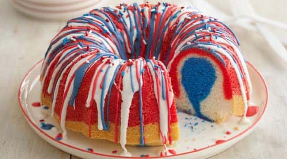 Firecracker Red, White and Blue Cake. Ingredients: 1 box Betty Crocker™ Super Moist™ white cake mix, Water, vegetable oil and whole eggs called for on cake mix box, 1 1/4 teaspoons Betty Crocker™ red gel food color, 1 1/4 teaspoons Betty Crocker™ blue gel food color, 1/2 cup Betty Crocker™ Rich & Creamy vanilla frosting (from 16-oz container), 2 teaspoons Betty Crocker™ red, white and blue candy sprinkles, if desired. Make it: Heat oven to 350°F. Generously spray 12-cup fluted tube cake pan with baking spray with flour. In large bowl, beat cake mix, water, oil and eggs with electric mixer on medium speed 2 minutes, scraping bowl occasionally. In small bowl, place 1 cup of the batter; stir in 1 teaspoon of the red food color until blended. In another small bowl, place 1 cup of the batter; stir in 1 teaspoon of the blue food color until blended. Pour red cake batter into bottom of pan. Carefully pour remaining white batter over red batter in pan. Carefully pour blue batter over white batter. (Blue batter does not need to cover white batter completely; it looks better if it just forms a ring in the center of the white batter.) Bake 40 to 45 minutes or until toothpick inserted in center comes out clean. Remove cake from oven. Let stand 10 minutes, remove from pan to cooling rack. Cool completely, about 1 hour. Place cake on cooling rack over waxed paper or cooking parchment paper. In small microwavable bowl, place 1/4 cup of the frosting. Microwave uncovered on High 10 to 15 seconds or until thin enough to drizzle over cake. With spoon, drizzle warmed frosting back and forth over cake in striping pattern. Divide remaining frosting between 2 small microwavable bowls. To 1 bowl, stir in 1/4 teaspoon red food color until well blended. Microwave uncovered on High 5 to 10 seconds or until thin enough to drizzle. Drizzle over cake. Repeat with remaining bowl of frosting and 1/4 teaspoon blue food color. Sprinkle candy sprinkles on top. Let stand about 30 minutes or until frosting is set. Store loosely covered at room temperature.