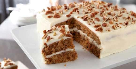 INGREDIENTS 1 pkg. (2-layer size) spice cake mix 3 large carrots, shredded (about 2 cups) 1 can (8 oz.) crushed pineapple in juice, drained 1 cup chopped PLANTERS Pecans, divided 2 pkg. (8 oz. each) PHILADELPHIA Cream Cheese, softened 2 cups powdered sugar 1 tub (8 oz.) COOL WHIP Whipped Topping, thawed MAKE IT 1. Heat oven to 350°F. 2. Prepare cake batter as directed on package; stir in carrots, pineapple and 3/4 cup nuts. 3. Pour into 2 greased and floured 9-inch square pans sprayed with cooking spray. 4. Bake 25 to 30 min. or until toothpick inserted in centers comes out clean. Cool cakes in pans 10 min. Remove from pans to wire racks; cool completely. 5. Beat cream cheese and sugar in large bowl until blended. Whisk in COOL WHIP. 6. Stack cakes on plate, filling and frosting with cream cheese mixture. Sprinkle with remaining nuts.