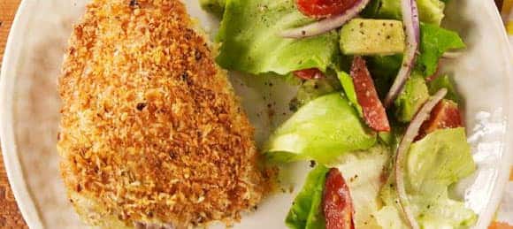 INGREDIENTS: 4 bone-in, skin-on chicken thighs, Kosher salt, Freshly ground black pepper, 1 cup Panko breadcrumbs, 1 tsp garlic powder, 1 tsp Italian seasoning, 2/3 cup freshly grated Parmesan, 2 large eggs. MAKE IT: Season chicken with salt and pepper. In a shallow bowl, whisk together panko, garlic powder, Italian seasoning, and Parmesan. In another shallow bowl, beat eggs. Dip chicken thighs in egg, then roll in Panko mixture until fully coated. Cook in air fryer at 360º for about 25 minutes or until golden and cooked through.