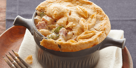 - Beat egg and water with fork until blended; brush onto top edges of ramekins. Top with pastry rounds; press gently onto top edges of ramekins to seal. Top with leaf cutouts; brush lightly with egg wash. Discard any remaining egg wash. Place ramekins on baking sheet. Cut slits in crusts to vent.