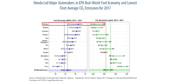 Honda ranks as the most fuel-efficient automaker in America in a new report from the U.S. Environmental Protection Agency (EPA) released today. Honda has the highest fleet average fuel economy and lowest CO2 emissions of any major automaker for the 2017 model year (MY2017), the latest year for which full data is available, according to the report. The 2019 EPA Automotive Trends Report ranked Honda first with a U.S. fleet average fuel economy of 29.4 miles per gallon (mpg), a five-year improvement of 3.1 mpg, and 4.5 mpg above the industry average for MY2017. Similarly, Honda’s fleet-average CO2 emissions reached an industry low of 302 grams/mile, an improvement of 36 grams/mile from 2012 results and 55 grams/mile better than (below) the industry average for the 2017 model year.