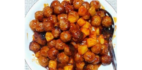 Slow Cooker Pineapple BBQ Meatballs. INGREDIENTS: 1/2 bag of frozen meatballs (I used half of the 32 oz of the Great Value Fully Cooked Homestyle Meatballs) 1 18 oz bottle of BBQ sauce (or any BBQ sauce of your choice) 1 20 oz pineapple chunks with juice 1/2 cup brown sugar.
