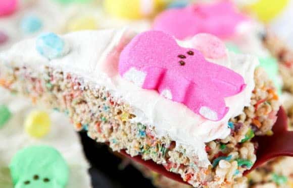 - Spread frosting onto rice krispie pizza. Decorate with Peeps and Easter M&Ms.