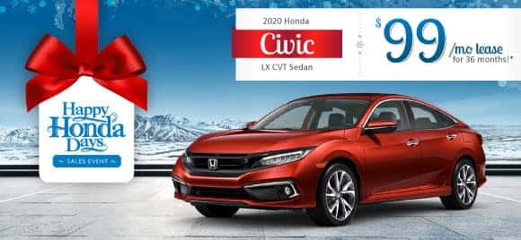 *2020 Civic LX CVT Sedan – MSRP: $21,480 – FC2F6LEW. 36 month closed end lease. $3499 trade or cash down. First payment, $595 acquisition fee, taxes and DMV fees due at signing. 10,000 miles/year. $0.15 overage. To qualified buyers through AHFC. Lessee responsible for maintenance, excess wear/tear and up to $0.20/mi. over 10,000 miles/year. Dealer may affect actual payment. Offers valid through 1/4/21.