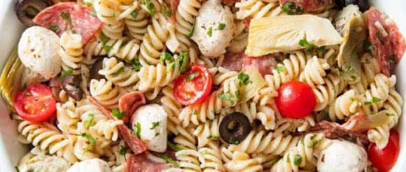 In a large bowl, toss together pasta, mozzarella, salami, spinach, tomatoes, artichokes, and olives. To make the dressing, add olive oil, vinegar, garlic, Italian seasoning, parsley, and red pepper flakes to a jar and secure with a lid then shake to combine. Season with salt and pepper to taste. Dress pasta with dressing and serve. Recipe credit: delish.com.