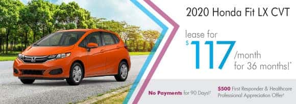 2020 Fit LX CVT – MSRP: $17,920 – GK5H4LEW. 36 month closed end lease. $3499 trade or cash down. First payment, $595 acquisition fee, taxes and DMV fees due at signing. 12,000 miles/year. $0.15 overage. To qualified buyers through AHFC. Offer valid through 7/6/20. † Valid on New Honda vehicles. Subject to credit approval. Prior sales excluded. See dealer for complete details. Offer expires 7/6/20. † Eligible First Responders & Healthcare Professionals receive $500 toward any new and untitled 2019 or newer Honda when financed or leased through HFS. Non-HFS customers are not eligible. Must be disclosed as Down Payment or Cap Cost Reduction Assistance. Prior sales excluded. Expires 7/6/20.