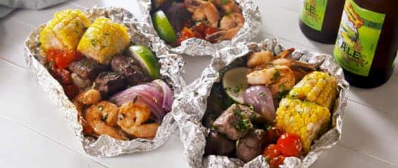INGREDIENTS: 1/2 lb. sirloin steak, cut into 1″ cubes 1/2 lb. shrimp, cleaned and deveined 2 ears corn, each cut crosswise into 4 pieces 1 c. grape tomatoes 1 small red onion, cut into thick slices 1 lime, sliced into wedges 2 garlic cloves, thinly sliced 1 tbsp. Old Bay Seasoning 1 tbsp. fresh thyme leaves 1 tsp. cumin Freshly cracked black pepper 1 tbsp. freshly chopped parsley, for garnish Lime wedges, for garnish