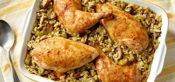 MAKE IT: Heat oven to 350°F. Grease 13×9-inch (3-quart) baking dish. Pour uncooked rice over bottom of greased dish. Sprinkle evenly with seasoning mix packet. Arrange chicken pieces over rice. Spoon celery and mushrooms around chicken. In medium saucepan, combine water and soup; mix well. Bring to a boil. Pour evenly over chicken and vegetables. Sprinkle chicken with paprika. Cover with foil. Bake at 350°F. for 1 hour. Uncover; bake an additional 20 to 30 minutes or until chicken is fork-tender and juices run clear. Let stand 5 minutes before serving.