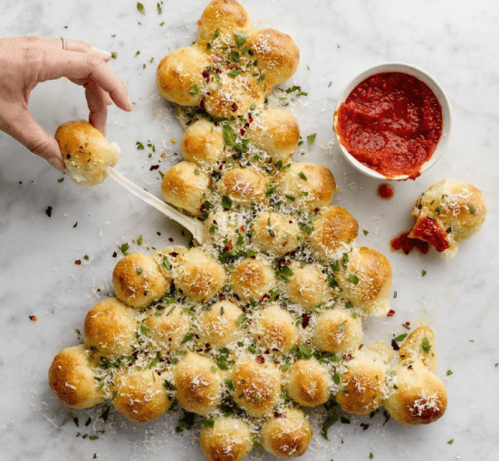Try this Pull-Apart Christmas Tree recipe featuring mozzarella sticks and pizza dough, perfect for holiday gatherings. Serve with marinara for a delightful treat.