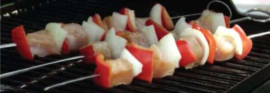 Directions 1. In a large bowl, whisk together oil, honey, soy sauce, and pepper. Before adding chicken, reserve a small amount of marinade to brush onto kabobs while cooking. Place the chicken, garlic, onions and peppers in the bowl, and marinate in the refrigerator at least 2 hours (the longer the better). 2. Preheat the grill for high heat. 3. Drain marinade from the chicken and vegetables, and discard marinade. Thread chicken and vegetables alternately onto the skewers. 4. Lightly oil the grill grate. Place the skewers on the grill. Cook for 12 to 15 minutes, until chicken juices run clear. Turn and brush with reserved marinade frequently. Recipe credit: allrecipes.com