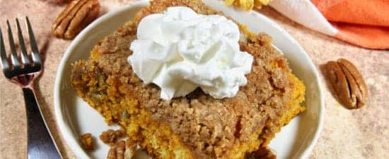 Enjoy a delicious Pumpkin Streusel Coffee Cake with this recipe. Ingredients include brown sugar, flour, pumpkin pie spice, butter, cake mix, eggs, pumpkin puree, cinnamon, and pecans. Follow the directions to bake this delightful treat.