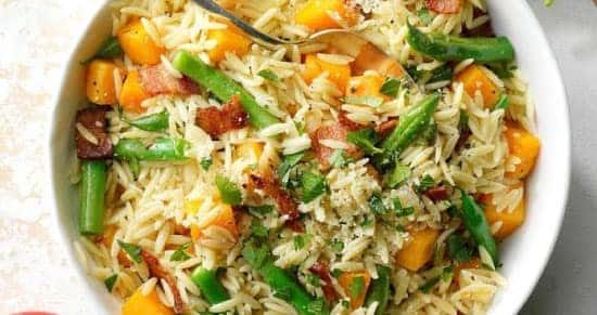 3. Drain orzo; stir into squash mixture. Add butter, garlic salt, pepper and reserved bacon; heat through. Sprinkle with Parmesan and parsley. |
