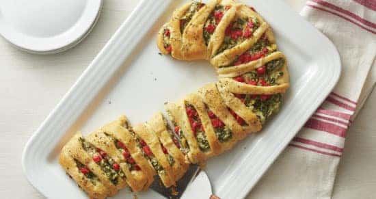 6. Fold over tips of dough to enclose filling; pinch ends of dough on edge to attach. Gently picking up top end of dough, curve one end of strip to form top of cane. Brush dough with melted butter; sprinkle with Italian seasoning.