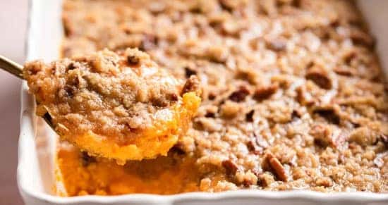 Yummy Sweet Potato Casserole Ingredients Sweet Potatoes: 4 cups peeled, cubed sweet potatoes 2 large eggs, beaten ½ cup white sugar ½ cup milk 4 tablespoons butter, softened ½ teaspoon vanilla extract ½ teaspoon salt Pecan Topping: ½ cup packed brown sugar ⅓ cup all-purpose flour 3 tablespoons butter, softened ½ cup chopped pecans Directions 1. Preheat oven to 325 degrees F (165 degrees C). 2. Prepare sweet potatoes: Put sweet potatoes in a medium saucepan and cover with water. Cook over medium-high heat until tender, 10 to 15 minutes. Drain and transfer to a large bowl. 3. Mash drained sweet potatoes with a fork. Add eggs; mix until well combined. Add sugar, milk, butter, vanilla, and salt; mix until smooth. Transfer to a 9×13-inch baking dish. 4. Make topping: Mix brown sugar and flour together in a medium bowl. Cut in butter with a pastry cutter until mixture is coarse and looks like peas; don’t overmix. Stir in pecans. Sprinkle topping over sweet potato mixture. 5. Bake in the preheated oven until topping is lightly browned, about 30 minutes. Receipe credit: www.allrecipes.com