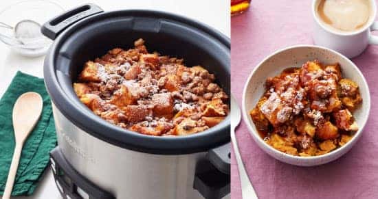 Slow Cooker Pumpkin French Toast Casserole Ingredients For the casserole: 1 (16-ounce) loaf brioche, cut into 1-inch pieces Cooking spray or unsalted butter 6 large eggs 2 cups half-and-half 1 (14-ounce) can pumpkin purée 3 tablespoons granulated sugar 1 tablespoon pumpkin pie spice 1 teaspoon pure vanilla extract 1/4 teaspoon kosher salt Powdered sugar, for serving (optional) Maple syrup, for serving (optional) For the crumb topping: 1/4 cup all-purpose flour 3 tablespoons packed light brown sugar 3 tablespoons chopped, toasted pecans 1/2 teaspoon ground cinnamon 1/2 teaspoon ground nutmeg Pinch kosher salt 2 tablespoons unsalted butter, melted Directions 1. Arrange a rack in the middle of the oven and heat to 250°F. 2. Place the bread in a single layer on a rimmed baking sheet and toast, stirring halfway through, for 20 minutes. Set aside to cool slightly. 3. Generously coat a 6-quart or larger slow cooker with cooking spray or butter. Arrange the toasted bread evenly in the slow cooker and set aside. 4. Place the eggs in a large bowl and whisk to combine. Add the half-and-half, pumpkin, sugar, pumpkin pie spice, vanilla, and salt and whisk to combine. Pour the custard over the bread. Use a wooden spoon to gently stir so all the cubes are evenly coated and soaked through. Cover and refrigerate overnight, if desired. 5. If necessary, remove the uncooked casserole from the refrigerator and let it sit at room temperature while you make the crumb topping. Make the crumb topping 1. Stir the flour, sugar, pecans, cinnamon, nutmeg, and salt together in a medium bowl. Drizzle with the butter and stir until big, slightly floury crumbs form. 2. Sprinkle the crumb topping evenly over the casserole. Place a large sheet of paper towels over the slow cooker, making sure it completely covers the top of the slow cooker but does not sag down onto the casserole. Cover and cook until set, 4 hours on the LOW setting or 2 hours on the HIGH setting. 3. Right before serving, dust with powdered sugar if desired. Serve warm with maple syrup if desired.