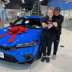 Mr. Benjamin Cohen surprised his beautiful new wife with a Honda Civic Sport 6 Speed. This is Mrs. Cohen’s dream car & her first brand new vehicle! She had no idea that “Santa Ben” had it on his Christmas list for her. She was astounded, thrilled, and so happy she was shaking like a leaf. Thanks to salesman Chuck Markham and his trusty helpers, Rudolph and Frosty, for making this a truly Happy Honda Christmas.