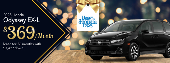 2025 Honda Odyssey EX-L – Stk #56H6308. MSRP $43,315. Model RL6H6SJNW. $3499, 1st payment, $595 acquisition fee, taxes, & DMV fees due at signing, 10k mi/yr. $.15 overage. To qualified buyers thru AHFC. Lessee responsible for maintenance, excess wear/tear and up to $.20/mi. over 10k mi/yr. Not all customers will qualify. See dealer for details. Expiration 1/2/25.