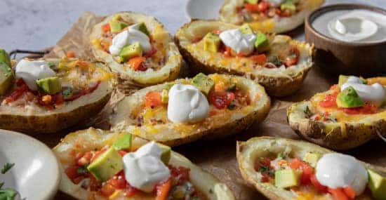 Nacho Potato Skins Ingredients 4 baking potatoes (2 lb.) 1/3 cup salsa 1/4 cup chopped fresh cilantro, divided 1 cup KRAFT Mexican Style Shredded Four Cheese 1/2 cup BREAKSTONE’S Sour Cream 1/2 cup each chopped avocados and tomatoes Directions Prick potatoes with fork; place on microwaveable plate. Microwave on HIGH 10 to 12 min. or until potatoes are tender. Cool 10 min. Heat oven to 375°F. Cut potatoes lengthwise in half; scoop out centers, leaving 1/4-inch-thick shells. Refrigerate removed potato centers for another use. (See tip.) Place potato shells, cut sides up, on baking sheet sprayed with cooking spray. Spread salsa onto insides of shells; sprinkle evenly with 3 Tbsp. cilantro. Top with KRAFT cheese. Bake 12 to 14 min. or until cheese is melted. Top with sour cream, avocados and tomatoes; sprinkle with remaining cilantro. Receipe credit: kraftnaturalcheese.com