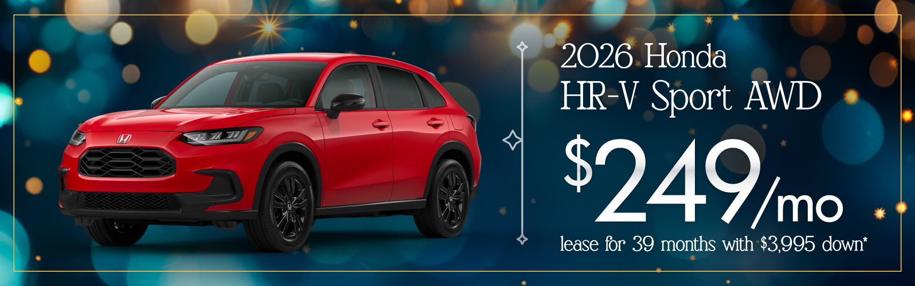 *2026 Honda HR-V Sport AWD – Stk #62H5497. MSRP $30,895. Model RZ2H5REW. $3995, 1st payment, $595 acquisition fee, taxes, & DMV fees due at signing, 10k mi/yr. $.20 overage. To qualified buyers thru Honda Financial Services. Lessee responsible for maintenance, excess wear/tear and up to $.20/mi. over 10k mi/yr. $500 Loyalty or Conquest amount toward Cap Cost Reduction with the lease through Honda Financial Services of a select new and not previously reported sold 2026 HR-V to qualified current owners of any 2010 or newer Honda, Buick, Chevrolet, Chrysler, Dodge, Fiat, Fisker, Ford, GMC, Hyundai, Jeep, Kia, Mazda, Mini, Mitsubishi, Nissan, Polestar, RAM, Rivian, Scion, Subaru, Tesla, Toyota, VinFast and Volkswagen. vehicles. Must provide proof of ownership of eligible vehicle in the form of a current vehicle registration or proof of valid auto insurance. No trade-in required. Offer excludes purchases made prior to the program period and is transferable among members of the same household when the retail delivery registration address matches the current address of the proof of ownership document. Not redeemable for cash. Incentive paid to dealer and requires dealer participation. Not all customers will qualify. See dealer for details. Expiration 1/5/26.