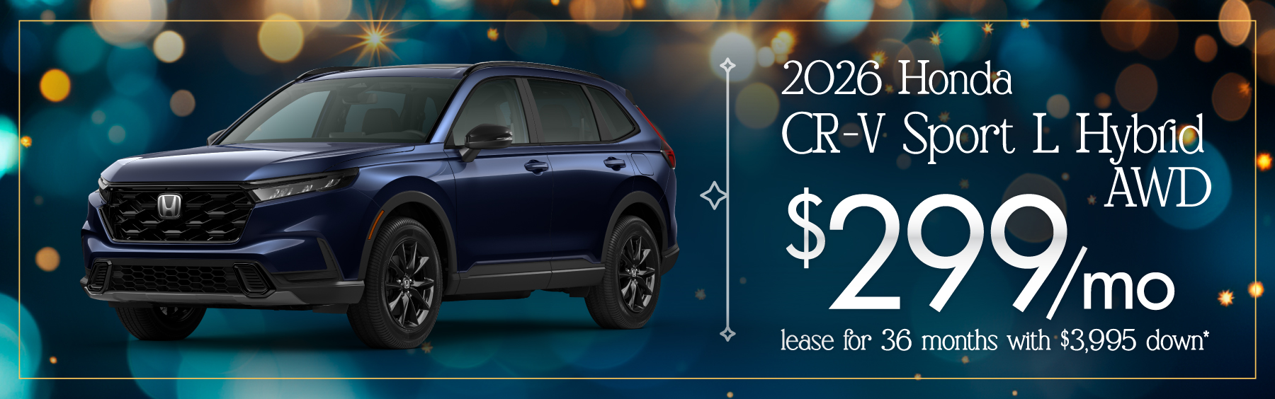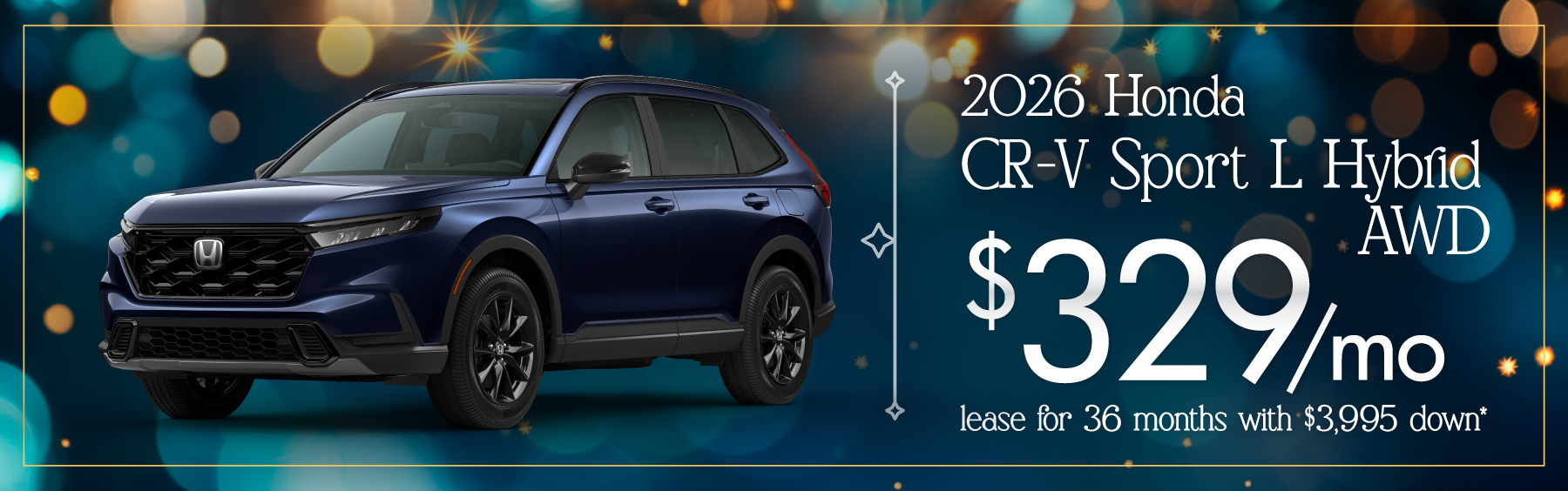 *2026 Honda CR-V Sport L Hybrid AWD – Stk #66H8386. MSRP $41,675. Model RS6H8TJFW. $3995 down, 1st payment, $595 acquisition fee, taxes, & DMV fees due at signing, 10k mi/yr. $.20 overage. To qualified buyers thru Honda Financial Services. Lessee responsible for maintenance, excess wear/tear and up to $.20/mi. over 10k mi/yr. $1,000 Loyalty or Conquest amount toward Cap Cost Reduction with the lease through Honda Financial Services of a select new and not previously reported sold 2026 CR-V to qualified current owners of any 2010 or newer Honda, Buick, Chevrolet, Chrysler, Dodge, Fiat, Fisker, Ford, GMC, Hyundai, Jeep, Kia, Mazda, Mini, Mitsubishi, Nissan, Polestar, RAM, Rivian, Scion, Subaru, Tesla, Toyota, VinFast and Volkswagen. vehicles. Must provide proof of ownership of eligible vehicle in the form of a current vehicle registration or proof of valid auto insurance. No trade-in required. Offer excludes purchases made prior to the program period and is transferable among members of the same household when the retail delivery registration address matches the current address of the proof of ownership document. Not redeemable for cash. Incentive paid to dealer and requires dealer participation. Not all customers will qualify. See dealer for details. Expiration 3/2/26.