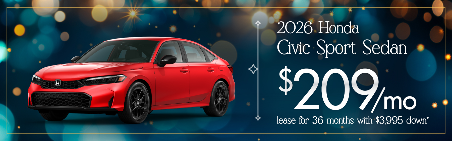 *2026 Honda Civic Sport Sedan – Stk #62F5567. MSRP $27,790. Model FE2F5TEW. $3995 down, 1st payment, $595 acquisition fee, taxes, & DMV fees due at signing, 10k mi/yr. $.20 overage. To qualified buyers thru Honda Financial Services. Lessee responsible for maintenance, excess wear/tear and up to $.20/mi. over 10k mi/yr. $750 Loyalty or Conquest amount toward Cap Cost Reduction with the lease through Honda Financial Services of a select new and not previously reported sold 2026 Civic to qualified current owners of any 2010 or newer Honda, Buick, Chevrolet, Chrysler, Dodge, Fiat, Fisker, Ford, GMC, Hyundai, Jeep, Kia, Mazda, Mini, Mitsubishi, Nissan, Polestar, RAM, Rivian, Scion, Subaru, Tesla, Toyota, VinFast and Volkswagen. vehicles. Must provide proof of ownership of eligible vehicle in the form of a current vehicle registration or proof of valid auto insurance. No trade-in required. Offer excludes purchases made prior to the program period and is transferable among members of the same household when the retail delivery registration address matches the current address of the proof of ownership document. Not redeemable for cash. Incentive paid to dealer and requires dealer participation. Not all customers will qualify. See dealer for details. Expiration 3/2/26.