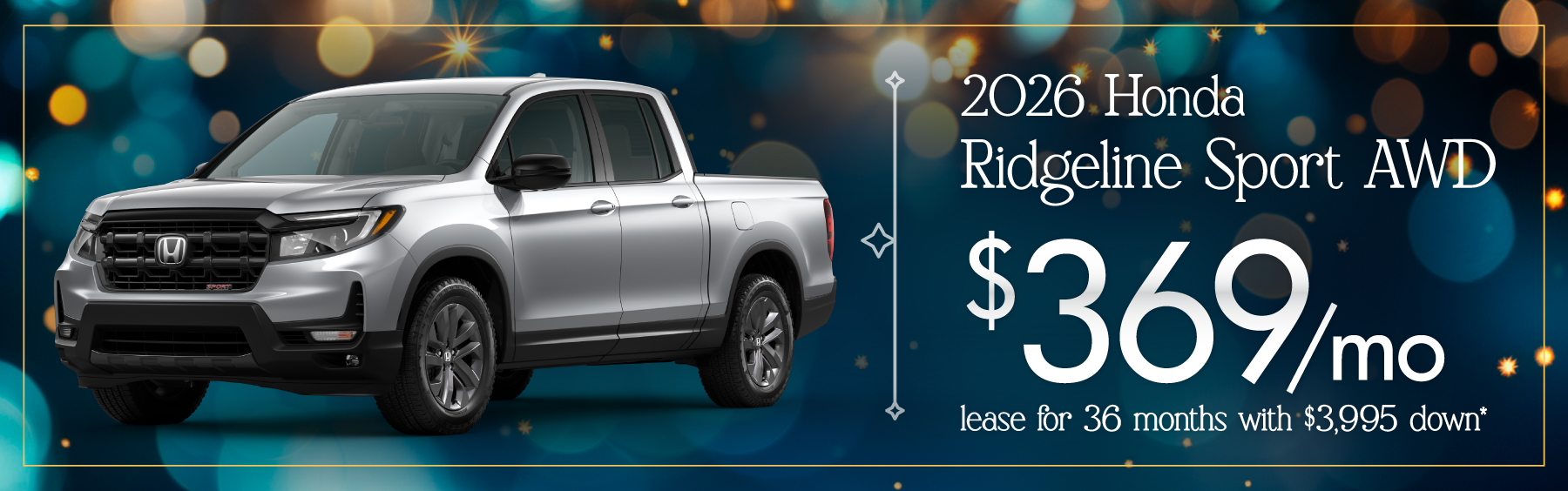*2026 Honda Ridgeline Sport AWD – Stk #63F1344. MSRP $42,090. Model YK3F1TEW. $3995 down, 1st payment, $595 acquisition fee, taxes, & DMV fees due at signing, 10k mi/yr. $.20 overage. To qualified buyers thru Honda Financial Services. Lessee responsible for maintenance, excess wear/tear and up to $.20/mi. over 10k mi/yr. Not all customers will qualify. See dealer for details. Expiration 3/2/26.