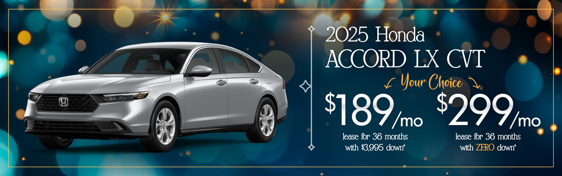 *2025 Honda Accord LX Sedan – Stk #51F2C84. MSRP $29,490. Model CY1F2SEW. $3995 down, 1st payment, $595 acquisition fee, taxes, & DMV fees due at signing, 10k mi/yr. $.20 overage. OR $0 down, $595 acquisition fee, taxes, & DMV fees due at signing, 10k mi/yr. $.20 overage. To qualified buyers thru Honda Financial Services. Lessee responsible for maintenance, excess wear/tear and up to $.20/mi. over 10k mi/yr. $1,500 Loyalty or Conquest amount toward Cap Cost Reduction with the lease through Honda Financial Services of a select new and not previously reported sold 2026 Accord to qualified current owners of any 2010 or newer Honda, Buick, Chevrolet, Chrysler, Dodge, Fiat, Fisker, Ford, GMC, Hyundai, Jeep, Kia, Mazda, Mini, Mitsubishi, Nissan, Polestar, RAM, Rivian, Scion, Subaru, Tesla, Toyota, VinFast and Volkswagen. vehicles. Must provide proof of ownership of eligible vehicle in the form of a current vehicle registration or proof of valid auto insurance. No trade-in required. Offer excludes purchases made prior to the program period and is transferable among members of the same household when the retail delivery registration address matches the current address of the proof of ownership document. Not redeemable for cash. Incentive paid to dealer and requires dealer participation. Not all customers will qualify. See dealer for details. Expiration 3/2/26.