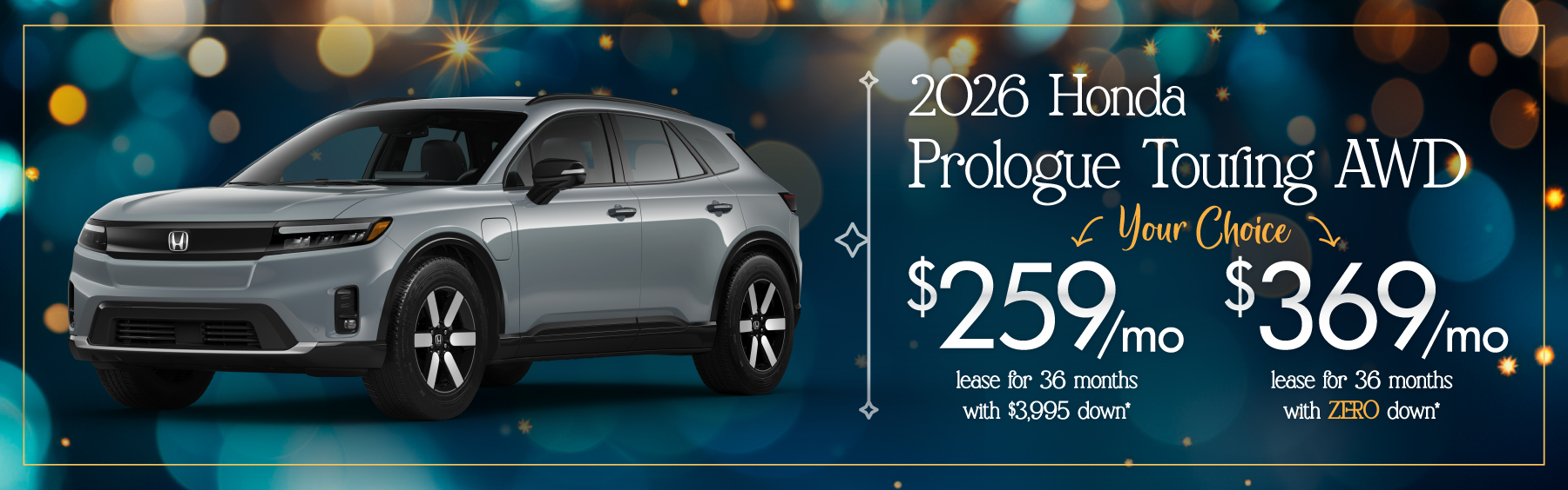 *2026 Honda Prologue Touring AWD – Stk #64H6485. MSRP $55,995. Model 3B4H6TJW. $3995 down, 1st payment, $595 acquisition fee, taxes, & DMV fees due at signing, 10k mi/yr. $.20 overage. OR $0 down, $595 acquisition fee, taxes, & DMV fees due at signing, 10k mi/yr. $.20 overage. To qualified buyers thru Honda Financial Services. Lessee responsible for maintenance, excess wear/tear and up to $.20/mi. over 10k mi/yr. $3,500 Loyalty or Conquest amount toward Cap Cost Reduction with the lease through Honda Financial Services of a select new and not previously reported sold 2026 Prologue to qualified current owners of any 2010 or newer Honda, Buick, Chevrolet, Chrysler, Dodge, Fiat, Fisker, Ford, GMC, Hyundai, Jeep, Kia, Mazda, Mini, Mitsubishi, Nissan, Polestar, RAM, Rivian, Scion, Subaru, Tesla, Toyota, VinFast and Volkswagen. vehicles. Must provide proof of ownership of eligible vehicle in the form of a current vehicle registration or proof of valid auto insurance. No trade-in required. Offer excludes purchases made prior to the program period and is transferable among members of the same household when the retail delivery registration address matches the current address of the proof of ownership document. Not redeemable for cash. Incentive paid to dealer and requires dealer participation. Not all customers will qualify. See dealer for details. Expiration 3/2/26.