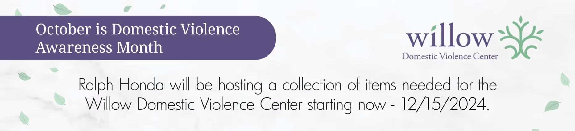 Ralph Honda will be hosting a collection of items needed for the Willow Domestic Violence Center beginning in October & ending on December 15, 2024. For anyone who donates, you will receive a $10.00 coupon that can be used towards any service visit. Please take your donation to our greeter or cashier.